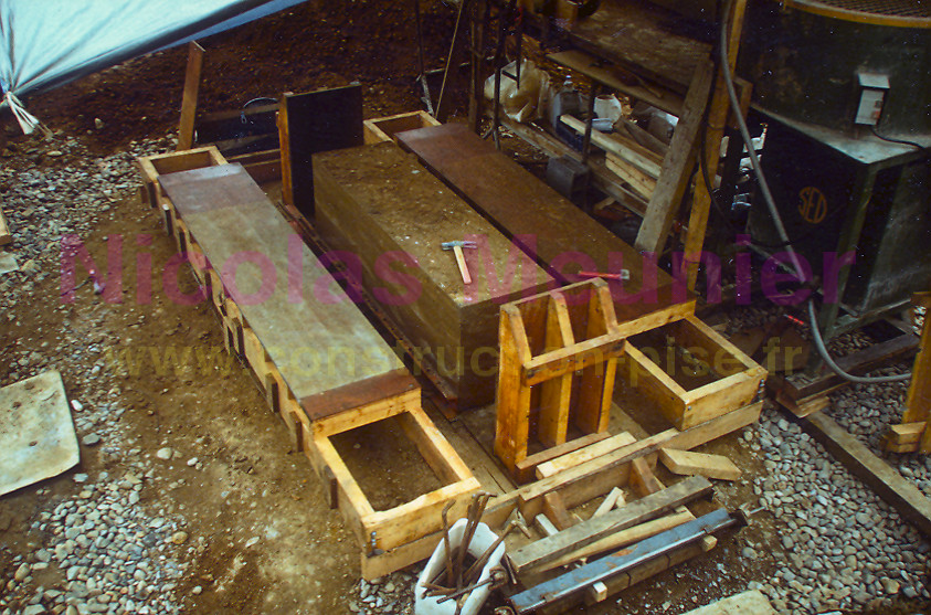 Le bloc est immédiatement démoulé, levé à la grue et positionné sur le mur, sur un lit de mortier de chaux.