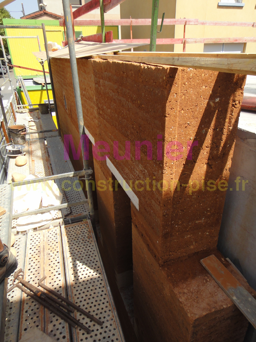 Création de murs de façade en pisé non porteur dans le cadre de la reconstruction de l’école maternelle des Roches de Condrieu.